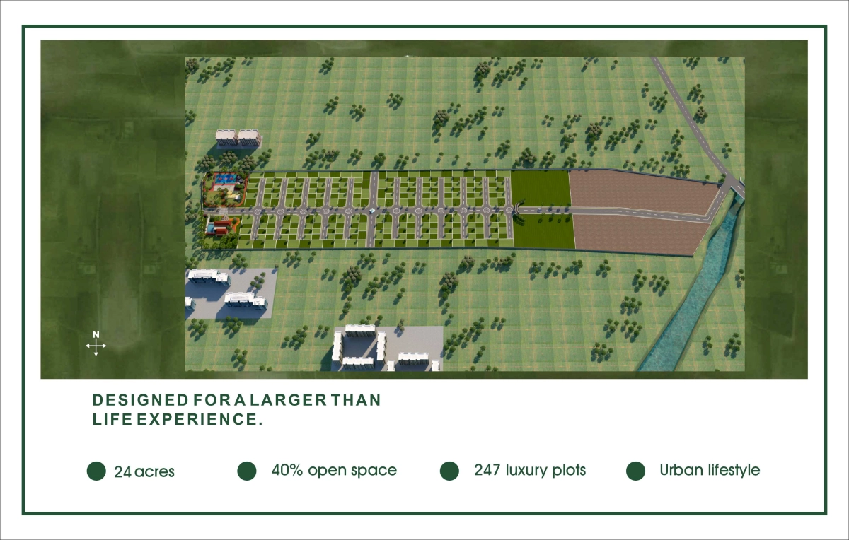 With 247 fully sanctioned NA plots of 1080 sq. ft. onwards, this expansive development invites you to design your own space surrounded by greenery, fresh air, and premium amenities — all within a secure, family-friendly environment.